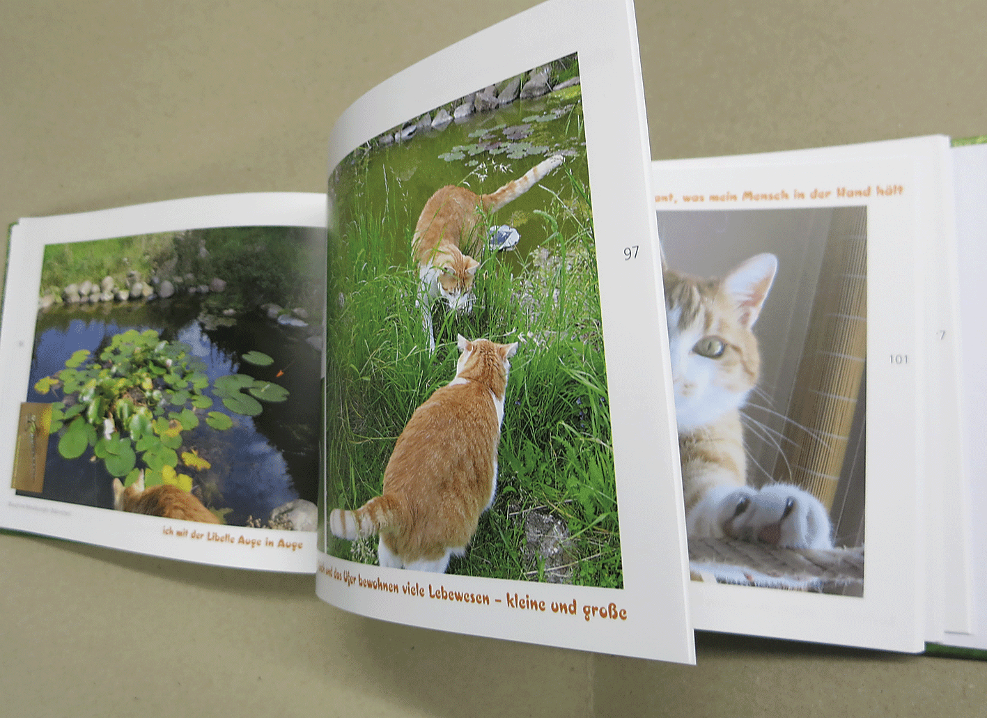 Format 14,8 x 21,0 cm (A5 quer) l 140 Seiten l vorwiegend großformatige Bilder (Katzen und andere Tiere) l Hardcover l Fadenheftung l 20 EUR